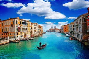 «Місто на воді», «музей просто неба», «місто вічних романтиків», де немає доріг і машин. Водні канали, гондоли та човни, сходи і мости, розкішні палаци і вузенькі вулички. Серце Венеції – площа Сан Марко із красивим собором середньовіччя Святого Марка. Створений природою Гранд Канал, наче головна артерія, до якої кріпляться дрібніші канали. Найкраще пересуватись тут у гондолі, милуючись неповторним шармом Венеції. Пам’ятний подарунок Венеції – карнавальна маска.